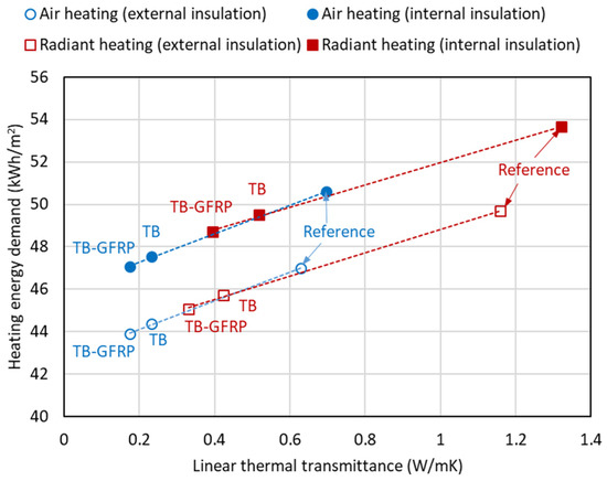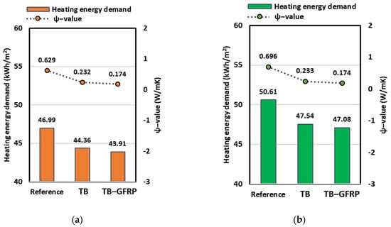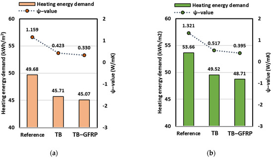 Figure 7 shows the simulation result of annual heating energy demands with air heating system. In both cases of external and internal insulation, the heating energy demand reduced when the TB (Case 2, 5) and TB-GFRP (Case 3, 6) were applied. For external insulation systems, the reduction rates of Cases 2 and 3 were 5.6% and 6.5%, respectively, compared to the heating energy demand without thermal breaks (Case 1, 46.99 kWh/m2). For internal insulation system, the heating energy demand without thermal breaks (Case 4) was 50.61 kWh/m2. The application of TB (Case 5) and TB-GFRP (Case 6) reduced the heating energy demand by 6.1% and 7.0%, respectively.
