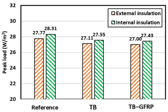 Peak heating loads for the analyzed cases were also evaluated, as shown in Figure 8. Similar to the heating energy demand results, the peak heating load also decreased with the application of thermal breaks. The reduction rate of peak heating load was up to 2.8% for the external insulation system and 3.1% for the internal insulation system. In both heating energy demand and peak heating load analysis, the TB-GFRP showed the biggest energy saving potentials at the balcony thermal bridge.