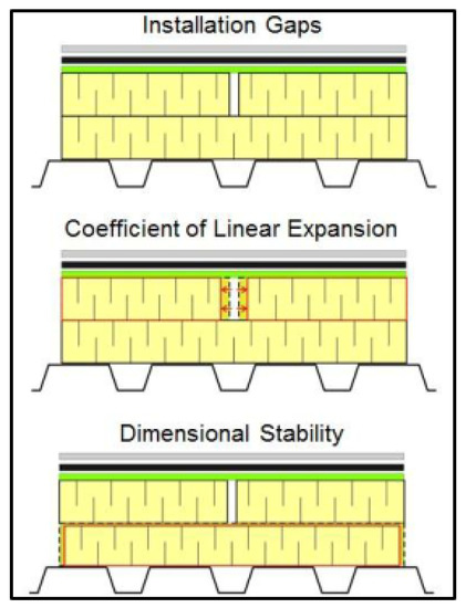 - The daily and seasonal temperature variations in the life cycle of the roof assemblies can cause the insulation boards to expand or contract depending on their coefficient of expansion. These changes in the board dimensions might not be permanent, and the boards could return to their original dimensions. However, this expansion and contraction leads to gap formation and transfers stresses to the attached components within the roof assembly;