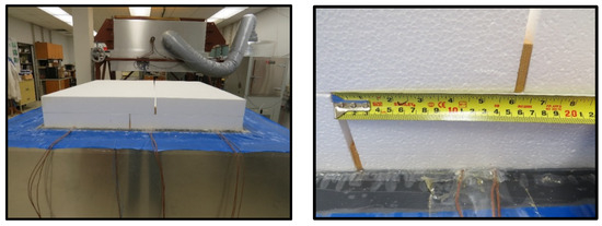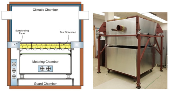 The thermal bypass, due to insulation gaps in roofing assemblies, was quantified using a 1.2 m × 1.2 m (4 ft by 4 ft) guarded hot box apparatus (GHB) (Figure 3). The GHB has been designed, constructed, and calibrated following the ASTM C1363 standard [8]. All of the thermal bypass experiments were conducted at a mean temperature of 24 °C (75 °F).