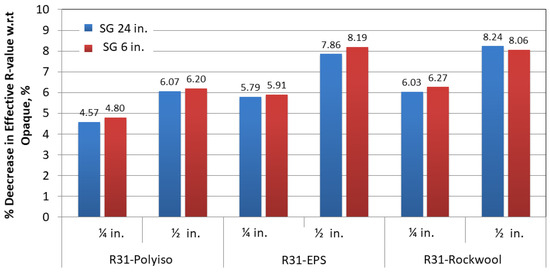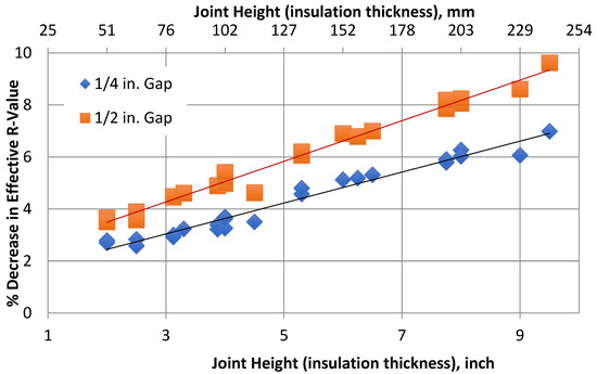 - Thermal bypass increases with the gap width between insulation boards. The relative (percentage) thermal bypass also increases as the gap height increases. Overall, the average loss in effective R-value ranged from 2% to 7% and 4% to 9% for 6.4 mm (1/4 in) and 12.7 mm (1/2 in), respectively, for gap height ranging from 51 mm (2 in) to 241 mm (9.5 in). Generalized gap impact curves applicable for all three design categories-R26, R31 and R36 were developed;
