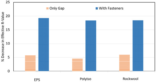 The testing on the joints and fasteners was conducted on the R31 assemblies for EPS, ISO, and Rockwool. The testing gap was maintained at 12.7 mm (1/2 in) in staggered joints at 610 mm (24 in) offset and with a fastener density of 10 fasteners per board (6.73 fasteners per m2, 0.625 fasteners per ft2). The percentage loss in R-Value is compared in Figure 9 between the case of only an insulation gap and the case of fasteners and insulation gaps. The 12.7 mm (1/2 in) gaps were responsible for 29% of the reduction in thermal resistance.