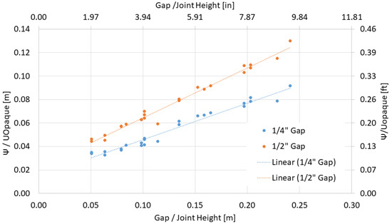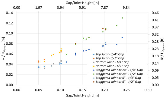 The Psi factor, as described above, was used as a means of normalizing the impact of gaps on the thermal performance of the roof assembly. As per the gap adjustment factor, the analysis of gap height and location was conducted on the systems considering the bottom, top, and the 610 mm (24 in) staggered gap [22]. In addition, the 152 mm (6 in) staggered gap configuration was also considered. To evaluate the impact of the gaps, the change in the Psi factor due to the gap in the insulation joint, , was divided by the U value of the system with no gap in the joint, Uopaque. This value was then graphed as a function of the joint height (or gap height) for all the configurations mentioned (Figure 10). The graph confirms the linear relationship between /Uopaque as a function of the Height of the Joint for all Joint Configurations.