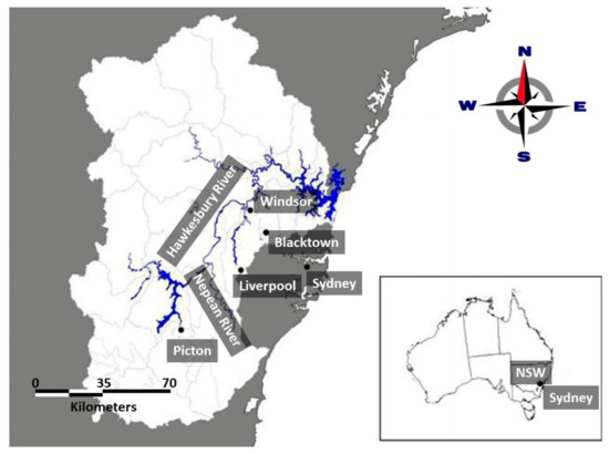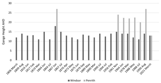 Generally, flood patterns since 1900 in NSW reflect rainfall patterns [20], and heavy rains have led to major, destructive floods around the Hawkesbury River (Figure 3) [21]. These same flood patterns have also played an important role in creating the landscape of Hawkesbury-Nepean Valley. The depositions of sediments during flood events have led to the formation of extensive floodplains around Richmond and Windsor for millions of years. The historical flood events in the region are described in the following sections.