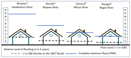 The third gap identified in the FRM (2017) is setting the appropriate risk levels. Towards this end, generally, for Australia, a flood planning level is set to 1% annual exceedance probability (AEP) [57]. Evidence from literature, however, indicates that setting 1% AEP is not adequate [58]. Regardless of this criticism, the AEP of 1% remains the most prevalent form of practice in the Hawkesbury-Nepean Valley [59].