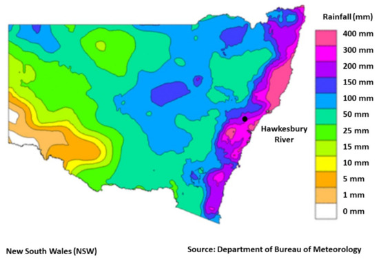 The Hawkesbury-Nepean region has experienced warming by 0.8 °C since 1950 and a decrease in the average annual rainfall of 20–500 mm per decade (across different parts of the region). While it is difficult to distinguish the impacts of anthropogenic activities, it is anticipated that the climate will be warmer in the future [6]. However, the changes in average rainfall pattern are ambiguous, as with an expected higher rate of evaporation, the catchment is likely to be drier. The combination of these conditions could lead to higher winds, more frequent heatwaves and fire risks. Despite these trends towards a dry condition in the catchment, the potential for extreme rainfall events is also rising [6].