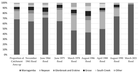 The largest flood event in the area occurred in 1987 during which, a level of 19.7 m Australian Height Datum (AHD) was reached by the river at Windsor. The flood event of 1987 represents a 1 in 500 chance of flood per year, a reading that is still being validated/verified [22]. Another recent flood event corresponding to greater than 1 in 20 chances per year occurred in 1978. The levels for several historical flood events at Penrith and Windsor in the Hawkesbury-Nepean Valley are presented in Figure 4. During flood events, variable contributions of different sub-catchments have been observed due to the construction of Warragamba Dam in 1960 as shown in Figure 4. Approximately, 42% of the flood at Windsor came from the Warragamba sub-catchment in the year 1986. Whereas, for the 1990 flood event, about 73% of the floodwaters at Windsor were contributed by the Warragamba catchment [23]. Figure 5 provides a representation of the flood event history in the Hawkesbury-Nepean Valley at Windsor with flood levels above 12.2 m.
