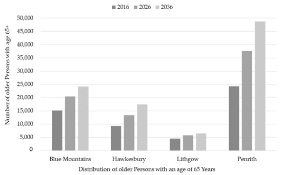 The State Government’s aged care facilities provide support to older citizens, but this must be achieved by bringing into consideration the accessibility and requirements of older citizens and by developing resilience in terms of flooding [40]. Furthermore, the population of citizens aged 65 years and above in the Nepean Blue Mountains (a region including Blue Mountains, Hawkesbury, Lithgow and Penrith LGAs) is projected to increase by over 20.7% by the year 2036. Additionally, by the year 2036, the highest growth is projected from 5600 to 16,300 individuals aged 85 years and above in the Nepean Blue Mountains. Figure 6 reports the population increase of older persons with an age of 65 years and above in Nepean Blue Mountains, by LGA, from the years 2016 to 2036 [41].