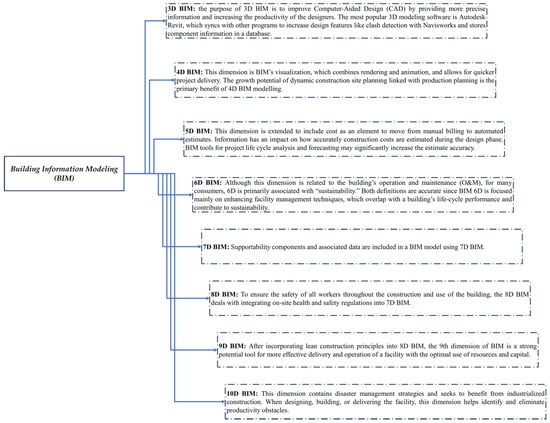 BIM can be an important component of information management in the AEC sectors by focusing on the need for information management and data interchange between stakeholders throughout the project lifecycle [3,4]. BIM is a set of procedures that helps enhance the building industry’s outputs, relationships, and responsibilities. To facilitate better communication among BIM stakeholders, these deliverables are organized according to the notion of “level of development,” a reference tool specifying minimum requirements for the features and details of components in 3D models [5,6,7]. Figure 1 shows the different dimensions of BIM.