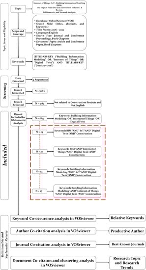 In this research, 5063 scholarly papers, including journal articles, proceeding articles, and book chapters concerning Building Information Modeling (BIM), Internet of Things (IoT), and Digital Twins (DT), have been gathered from the Web of Science (WOS) dataset as a data source. Subsequently, 3184 papers were omitted from further analysis since they were unrelated to the construction projects and were written in languages other than English. Consequently, 1879 papers were chosen for a bibliometric and systematic review analysis. In the field of construction management science, there are no established protocols for comprehensive literature reviews [49]. However, research might use keyword searches to discover relevant information and apply any necessary analysis. Figure 3 shows the methodological procedure framework of this study [50]. The four-step process used in this article has been implemented, including defining the borders, identifying the research questions, choosing the papers to include in the search, doing a bibliometric analysis, and presenting the findings. This review approach makes an effort to understand the relationships among authors, regions, keywords, and journal citations and offers a brief assessment of state-of-the-art existing or emerging research fields.