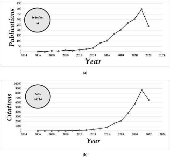 (a) Number of publications from 2006 to 2022; (b) Number of citations from 2006 to 2022.