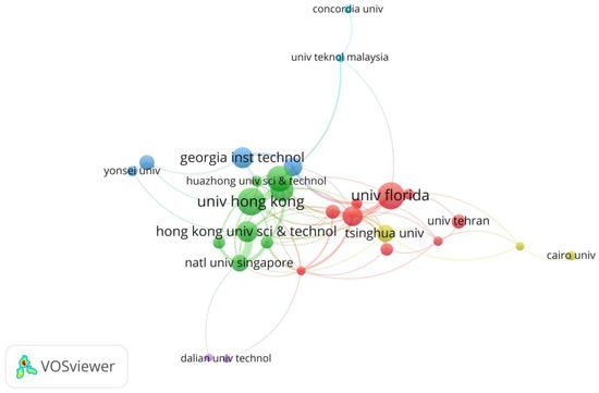 The 20 organizations with the most scholarly articles in the relevant fields are shown in Table 2. The categorization reveals that most of the productive institutions are from Asia. The University of Hong Kong is the most prolific organization and produced 51 publications over the mentioned period. The University of Florida has 50 publications, followed by Hong Kong Polytechnic University (48 publications). Based on the data, it could be inferred that the most influential organizations are from Asia. Furthermore, the Georgia Institute of Technology has the highest average citation per publication value among 20 universities, and the National University of Singapore is the best university, with an excellent ranking worldwide in 2022. Figure 6 displays the renowned universities that published papers on the subjects and the institutional collaboration.