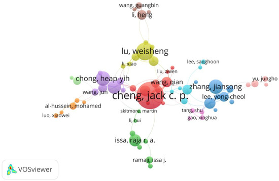 The author productivity section uses the co-authorship indicator to identify more productive and collaborative authors. It helped us rate the authors according to the number of papers and citations they had received. There were 4632 authors responsible for publishing 1879 documents that were extracted; however, only 109 authors had published five or more publications. Of the 4632 authors identified by VOSviewer, we concentrated on the top 20 authors with documents and citations. Table 4 displays the twenty most prolific researchers in the topic under study. Jack C.P. Cheng of the Hong Kong University of Science and Technology is the most prolific author, having written 34 articles with a total of 936 citations over the analysis period. Regarding citations received in this study topic, CM Eastman placed first. With a total of 22 research publications, Wilson LU placed second, and Heap-Yih (John) Chong and Jiansong Zhang follow with 18 articles.