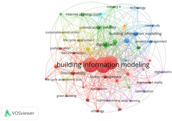 Meanwhile, after the coronavirus pandemic, the keywords “COVID-19” (three times) and “COVID-19 management” (one time) have been indicated as the keyword among studied documents in the field of BIM in construction projects. As shown in Table 1, the keyword “Building Information Modeling” is the most popular author keyword in the literature, followed by “Building Information Modeling (BIM)”. Based on the data, Building Information Modeling has been used in different forms in the pieces of literature, such as BIM, Building Information Modeling, Building Information Modeling (BIM), building information modelling (BIM), building information model (BIM), BIM implementation, building information modelling, building information model, BIM technology, building information model/modeling (BIM), and BIM (building information modelling). Regarding the Internet of Things, the keywords “Internet of Things” and “Internet of Things (IoT)”, and for Digital Twin, the keywords “digital twin” and “digital twins” are the most prominent. In terms of the number of links, “Building Information Modeling” and “Building Information Modeling (BIM)” have the highest among other nodes.