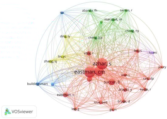Co-citation analysis is a frequently used approach in bibliometric studies that helps map a subject’s intellectual structure and explore the academic connections between the significant works in a field. The co-citation approach is based on the frequency with which two pieces of prior literature are cited in a subsequent paper [59,60,61]. Figure 9 shows the author’s co-citation network, which consists of five clusters and 15,282 links. The author with the most citations is Azhar, et al. [62], with a total of 530. The second is Eastman, et al. [63], which has 524 citation counts. The third is Sacks and Pikas [64], which have 445 citations, and the fourth is Succar [48], with 291 citations.