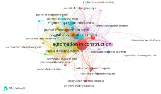 Nonetheless, Figure 10 shows the journal citation analysis in VOSviewer software. 443 sources, including journal and conference papers, are identified using VOSviewer in this study, but with the minimum number of source documents set to 5, only 56 sources meet the set threshold. There remain 644 links, 4886 total link strengths, and 10 clusters. The clustered, red, green, and blue columns comprise the cluster colors file. The clustered column provides cluster identification numbers. A cluster number must be between 1 and 1000 integers. The red, green, and blue columns include the red, green, and blue cluster color components, respectively. Each color component must be a positive integer between 0 and 255 [65]. For example, cluster 1 is a red color (Automation in Construction, Ain Shams Engineering Journal, Canadian Journal of Civil Engineering, Construction Research Congress 2022: Project Management and Delivery, Controls, and Design and Materials, etc.), and cluster 4 is yellow (Building and Environment, Energy and Buildings, Journal of Architectural Engineering, etc.).