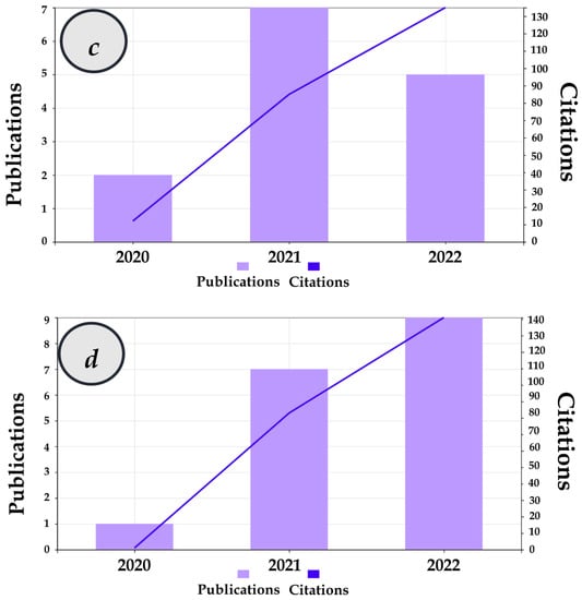 Furthermore, the number of citations is provided in Figure 4b, in which the total number of citations is 30,216, and 22,746 are without self-citations. The average citation per item and H-index are 16.02 and 78, respectively. It is evident that the number of citations has increased exponentially from 2006 to 2021; even though there remains a reduction in the number of citations in 2022, only its first eight months have been considered in this study.