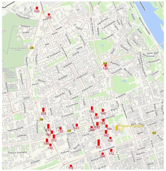 In the period analyzed—the years 1989–2022—a total number of 24 buildings exceeding a height of one hundred meters were completed in Warsaw. These are grouped mainly in the central area of Warsaw—Śródmieście—and in the western part of the Wola district, with individual cases of implementation in the Żoliborz district. The locations of the studied objects are shown in Figure 1.
