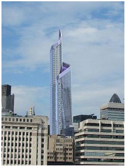 The first type of list of types of forms of skyscrapers coherent (relating to global implementations) is given in the article by Musiał R., The Game of Associations: The Shape of a Tall Building [29]; four types of forms of contemporary high-rise buildings were distinguished: a spiral form, e.g., the concept of Bishopsgate Tower in London, designed by KPF (Figure 2); a form of a pyramid, e.g., The San Francisco Transamerica, designed by W.L. Pereira (Figure 3); an obelisk, e.g., Trump World Tower in New York, designed by C. Condylis (Figure 4); and a gate and a triumphal arch, e.g., La Grande Arche de La Défense in Paris, designed by J.O. von Spreckelsen (Figure 5).