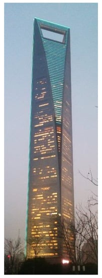 An extended classification of forms of high-rise buildings in comparison with the study by R. Musiał can be found in the study Integration of Architectural Design with Structural Form in Non-Orthogonal High-Rise Buildings [30]. The classification of non-orthogonal forms of high-rise buildings was developed and given as follows: pyramidal forms, e.g., Transamerica Building in San Francisco (Figure 3); leaning forms, e.g., The Gate Of Europe in Madrid, designed by P. Johnson (Figure 6); twisted forms, e.g., Turning Torso in Malmo, designed by S. Calatrava (Figure 7); free forms, e.g., CCTV Tower in Beijing, designed by OMA project (Figure 8); dynamic forms, e.g., the Dynamic Tower concept in Dubai, designed by D. Fisher; aerodynamic forms, e.g., Shanghai World Financial Center, designed by Kohn Pedersen Fox (Figure 9); and regional forms, e.g., Jin Mao Tower, designed by SOM in Shanghai (Figure 10).