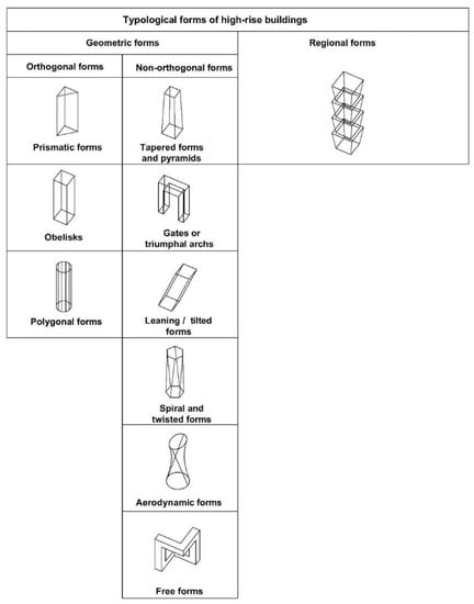 Preliminary research allowed the definition of formal types of commonly constructed high-rise buildings. Geometric forms and regional forms were selected. Among the geometric forms, orthogonal forms were distinguished: prismatic, obelisk, and polygonal forms; and non-orthogonal forms: tapering and pyramid, triumphal arch and gate, inclined, spiral and twisted, aerodynamic, and free forms. This classification was developed for the purpose of comparative study of the analyzed Varsovian buildings.