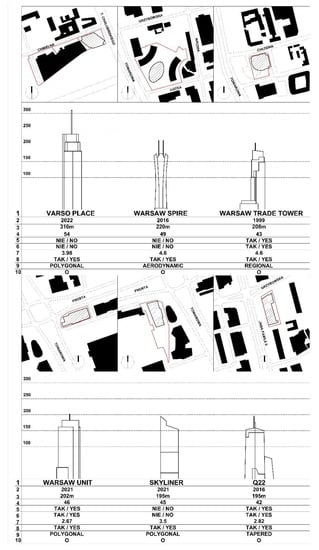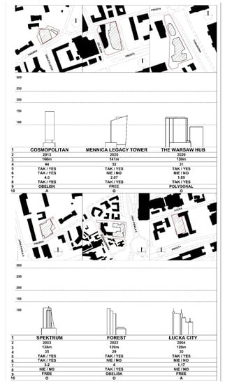 The topic of the paper is the analysis of the types of the form of high-rise buildings built in Warsaw in the years 1989–2022. The year 1989 was chosen as the turning point for new opportunities, combined with access to techniques and methods of building high-rise buildings, which is related to the beginning of the political transformation in Poland. The scale of the buildings was defined as a minimum of one hundred meters in height. This is the height that is recognized in the literature as meaning buildings called skyscrapers [7,8]. This scale was adopted due to its characteristic significant impact on the city, which takes place both on the program level (due to a large number of users of these buildings) and a spatial level, as elements determining the features of the city’s image, e.g., roads, edges, areas, nodes, landmarks [9,10] or urban markers, lines, border lanes, and streets [11].