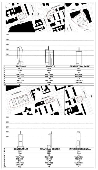 A similarly characteristic feature of the objects—the construction of the tower part, especially in the case of forms connected with the podium, at the border of the public space—will be maintained. The reason for this is the decreasing number of available areas with a larger area on which high-rise buildings can be built. Smaller downtown investment plots on which high-rise buildings will be built will result in solutions where the maximum tower will fill the area; irregular shapes of plots and the need to provide additional lighting to the surrounding buildings will provoke the implementation of polygonal forms, or—as in the case of the Inter-Continental building—free forms. Therefore, there is no uniform typological pattern for the Warsaw projects in the analyzed period. The transition from the realization of free forms to polygonal forms proves the variability in the dominant type of constructed buildings. For this reason, research and determination of this variability should be continued in the future.