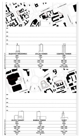 - Jóźwik, R. Wieżowiec jako element struktury miasta. In Nowoczesność w Architekturze: Nowoczesne Miasto Policentryczne; Witeczek, J., Ed.; Wydział Architektury Politechniki Śląskiej w Gliwicach: Gliwice, Poland, 2009; pp. 193–200. [Google Scholar]