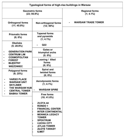 As a result, the surveyed buildings were classified into a previously defined typology. In addition to the typological classification, the formal features of the buildings under study were also examined: slenderness, the presence of a podium, the relationship of the form to the present context, and the position of the form in relation to the public space in the immediate vicinity. Research has shown that the typological forms present in Warsaw are obelisk, polygonal, tapering, aerodynamic, free, and regional. The most common of these are free forms—41.6%, polygonal forms—25%, and obelisk forms—20.8%.