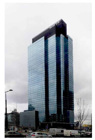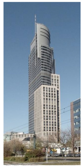 The above building was completed in 1999 according to the design of RTKL and Wyszyński, Majewski, Hermanowicz. The height of the building is 208 m and the slenderness of the tower part is 4.6. The tower part is a frontage of public space. The building has a podium referring to the height of the surrounding buildings. Its primary function is offices. The total area of the building in the above-ground part is approximately 54,800 m2. The form of the building consists of a tower connected to the podium with complementary functions—services and gastronomy. The tower part of the building connects to the public space [6]. The building was erected on a relatively large plot, in the dense development of the Wola district. In developing its shape, the issue of providing light to the existing buildings did not play a significant role. The form of the building and its architectural expression, according to the authors’ declaration, was to reflect the growth of Warsaw over time, and consists of differently shaped blocks with different facade solutions. This procedure, combined with the authors’ intentions, means that the form of the Warsaw Trade Tower can be classified as an example of a regional form in terms of typology. In the image of the city, the building is a recognizable landmark that marks the course of Towarowa Street.