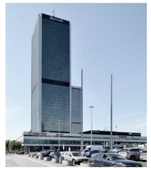 The building was erected in 1989 according to the design of a team led by J. Skrzypczak. The height of the building is 170 m and the slenderness of the tower part is 3.68. The tower part is not a frontage of public space. The building has a podium, but it does not correspond to the height of the surrounding buildings. Its primary function is a hotel and offices. The total area of the building in the above-ground part is approximately 87,600 m2. In the podium part of the building, there are service and commercial spaces organized in the form of a gallery. It is the most multifunctional building among the developments in Warsaw’s high-rise buildings [6]. The podium is extensive—it covers the entire quarter of two buildings—and its height does not correspond to the surrounding buildings. The form of the building is a classic solution for modernist high-rise buildings, consisting of an obelisk tower placed on a larger, horizontal podium. In the image of the city, the building is a recognizable landmark that marks the course of an important street—Aleje Jerozolimskie.