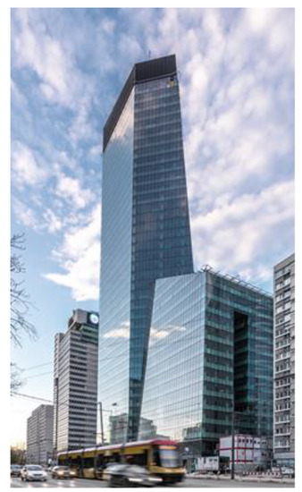 This building was built in 2004 according to the design of T. Spychała’s office. The height of the building is 164 m and the slenderness of the tower part is 4.5. The tower part is a frontage of public space. The building has a podium, but it does not correspond to the height of the surrounding buildings. Its basic function is a hotel with service spaces located in the podium. The total area of the building in the above-ground part is approximately 57,000 m2 [6]. The form of the tower part of the building is a cuboid whose lower half has been cut by a monumental clearance. The whole building is placed on a three-story podium that, in its scale and means of expression, does not refer to the previously existing context. The form of the building results from the necessity to provide adequate lighting to the existing residential buildings, as required by Polish law [42]; this is the purpose of the characteristic cut-out that transmits the sun’s rays towards the existing building, so as to provide it with the required 1.5 h of sunlight. The shape of the building is characteristic; it marks the course of Emilii Plater Street on a city scale. The role of the building in shaping the city’s image is to define a path and create a landmark.
