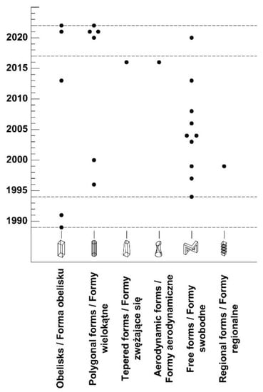 Statistically, throughout the analyzed period over the course of twenty-three years, the most frequently realized type of form was the free form. Nevertheless, it can be noticed that the dominant solution at the beginning of the analyzed period (1989–1994) was the form of the obelisk, the free form dominated in the middle part of the period studied, and in the last five years—2017–2022—polygonal forms dominated. Throughout this period, the forms of skyscrapers followed similar worldly examples, and the only strong local formal modification was the construction of the Warsaw Trade Tower skyscraper in 1999. This process resulted from the fact that its beginnings go back to the strong presence of the modernist style in the initial phase, combined with more modest technical possibilities of building high-rise buildings, which resulted in the implementation of the pioneering and simple-to-express forms of the obelisk in 1989–1994. Free forms dominated in the stylistic period focused on the implementation of architectural icons formally distinguished from the surrounding buildings (an example is the construction of the Złote Tarasy or Złota 44 buildings), and their implementation was associated with an increased inflow of capital and the development of implementation techniques of Polish contractors.