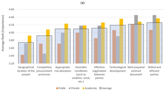 In this section, the experts were asked to rank the factors that lead to successful renewable-energy PPPs on a Likert scale from 1 to 5 according to their importance. Similarly, the experts were asked to rank the parameters that indicate the success of the projects in terms of their importance in evaluating renewable-energy PPPs. Figure 3a shows the average level of importance of the factors and their level of importance. In general, skilled and efficient parties, well-prepared contract documents, technological development, and effective negotiations were the main factors for the success of renewable-energy projects, in order of importance. However, Figure 3a shows that each party perceived the importance of each factor differently. For the public sector, well-prepared contract documents, skilled parties, technological development, and desirable conditions were the most important factors for the success of renewable-energy PPPs. For the private sector, well-prepared documents, skilled parties, desirable conditions, and effective negotiations between the parties were the main factors for the success of renewable-energy PPPs, in order of importance. For respondents from the academic sector, skilled parties, technological development, well-prepared contract documents, and effective negotiations between different parties were the main factors for the success of the projects.