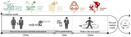 The trials were carried out simultaneously at the measured points. Before the trial, each respondent was briefed on the purpose of the experiment, methodology, and procedure. The respondents were then divided into five groups, and each group was randomly assigned to go to a space where they listened to a random sound in each space. A sound speaker was hidden at each measured point. Testers controlled the sound speaker so that it was set to play before each group of respondents arrived. Upon arrival, respondents were instructed to listen to the sounds and experience the environment for 15 min. The respondents were then asked to fill in the subjective questionnaire for 5 min. The respondents then moved to another trial site within 10 min. During the trial, the testers were asked to keep silent and static to prevent disturbing the respondents, and respondents were asked to stand throughout the experiment to prevent influences of different activity metabolism. The respondents visited five spaces and the five STPs randomly in half a day, without repetition (Figure 1). Such design controls for the order effect of an individual’s experimental results eliminated order bias [70].