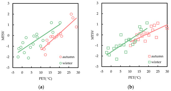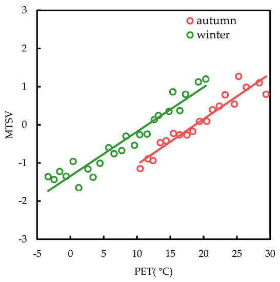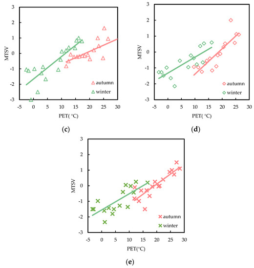 We calculated that the NPETautumn = 18.7 °C and the NPETR = 14.6−22.9 °C in autumn; the NPETwinter = 11.6 °C and the NPETR = 7.3–15.9 °C in winter. The NPET in winter and autumn, with the regression models of MTSV and PET, indicates that people can tolerate cold more in winter than in autumn. This may be because people have adapted to the cold environment (Figure 2).