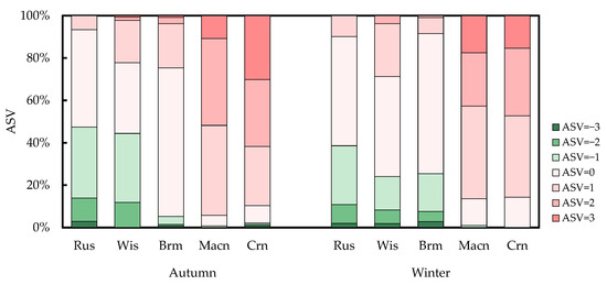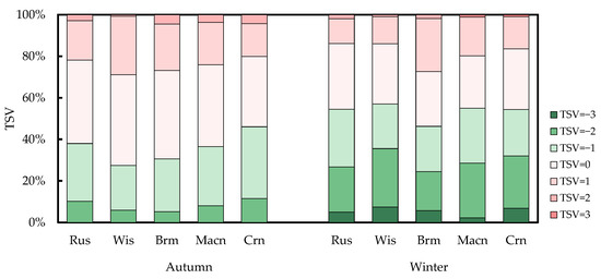 The TSV distributions at different STPs were similar in autumn and winter. In autumn, the proportions of “TSV = 0” in broadcasting music, running water and birdsong, wind (a gentle breeze) and insects, crowds, and machines were similar. In winter, the proportions of “TSV = −2” (25.71%) and “TSV = −3” (5.71%) in wind (a gentle breeze) and insects were the highest. This revealed that people preferred the colder TSV with wind (a gentle breeze) and insects (Figure 6).