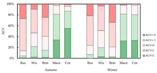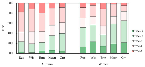 We calculated the percentages of TCVs at different levels in the total number of votes at different STPs. In autumn, TCVs for “discomfort” (TCV = −2, −1) were relatively high with machines (35.3%) and crowds (39.6%). The TCVs for “comfort” (TCV = 1, 2) with running water and birdsong (57.7%), wind (a gentle breeze) and insects (57.0%), and broadcasting music (56.7%) exceeded 50% and were basically equal, indicating the high thermal comfort of respondents. In winter, the TCVs for “discomfort” at different STPs were higher than that in autumn, which might be related to the meteorological environment in winter. The percentage of TCVs for “discomfort” was the highest with crowds (65.0%), but the percentage of TCVs for “comfort” was the highest with broadcasting music (45.3%). In autumn and winter, the respondents reported high thermal comfort with broadcasting music, but low with machines and crowd noise (Figure 7). This may be because different STPs caused different acoustic comfort, thus influencing the respondents’ thermal comfort.
