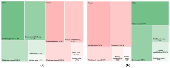 In autumn, the percentage of ACVs for acoustic comfort was relatively high with broadcasting music (86.3%), running water and birdsong (53.3%), and wind (a gentle breeze) and insects (59.7%). More than 50% of the respondents perceived a comfortable acoustic environment. Nevertheless, ACVs for acoustic comfort provided the completely opposite results with crowds and machines. Most respondents perceived that these two sound types brought them acoustic discomfort. Results demonstrated that different STPs influenced the acoustic comfort of people differently. We found no difference between winter and autumn ACVs despite different STPs.