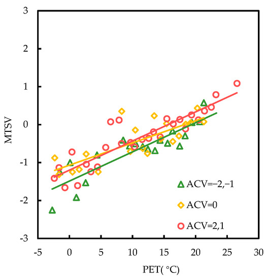 The relationship between PET and MTSV with different acoustic comfort levels was calculated and fitted linearly (Figure 9). With different ACV levels, the relationship between PET and MTSV was:
