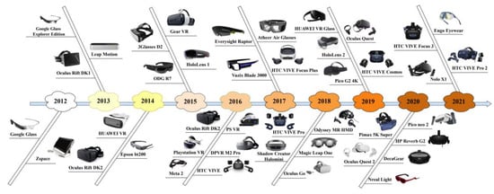 The development of AR/VR technologies is inseparable from the support of devices. At the preliminary stage of AR/VR development, heavy computers and large projectors were often used to present AR/VR effects [11]. With the rapid development of handheld devices, smart phones and tablets are widely used considering their lightness and popularity [12]. Users can experience AR/VR effects through their own handled devices instead of purchasing other expensive devices. However, users must hold and touch handheld devices when using the AR/VR application, making it difficult to perform other work simultaneously. With the development of HMDs, this limitation can be partially overcome [13]. Some HMDs can free users’ hands and provide immersive views with a better experience. Therefore, HMDs have the potential to become one of the mainstreams for AR/VR devices in the future. Since the 1960s, various HMDs appeared and were employed in various fields [14]. By analyzing and summarizing the emergence of the most used AR/VR devices in the past ten years (Figure 2), the constantly updated AR/VR devices are more reliable and also bring a better experience to users [15]. In addition, many companies have also been constantly updating their iterations of HMD, aiming to improve the performance of HMDs. For example, HTC have released the HTC VIVE in 2016, the HTC VIVE Pro with higher resolution in 2018, and the HTC VIVE cosmos in 2019 to give users an increasing comfortable experience. In 2021, HTC have released the HTC VIVE Focus 3 and HTC VIVE Pro2 with higher configurations in quick succession.