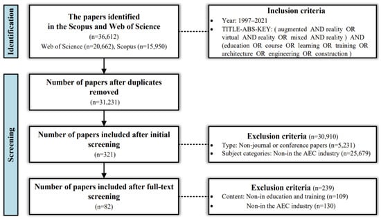 In this review, the specific search was conducted in Scopus and Web of Science, which are two commonly used academic databases. Studies published from 1997 to 2021 were filtered with the following keywords: (a) “augmented”, (b) “virtual”, (c) “mixed”, (d) “reality”, (e) “education”, (f) “course”, (g) “learning”, (h) “training”, (i) “architecture”, (j) “engineering”, and (k) “construction”, in the title, abstract, or keywords. In order to improve the searching efficiency and ensure the accuracy of search results, the search rules were: ((augmented OR virtual OR mixed) AND reality) AND (education OR course OR learning OR training OR architecture OR engineering OR construction). In total, 36,612 studies were found from two databases: Web of Science (n = 20,662) and Scopus (n = 15,950). First, the duplicate studies were removed and 31,231 studies were remained. The studies were further filtered via the exclusion of non-journal or conference studies (n = 5231) and non-AEC industry (n = 25,679) papers. Therefore, 321 articles were reserved through the initial screening. Next, a full-text screening process was adopted to ensure all retrieved articles were related to the education and training in the AEC industry. A total of 82 studies were finally reserved for bibliometric analysis. Figure 3 shows the database literature screening process.
