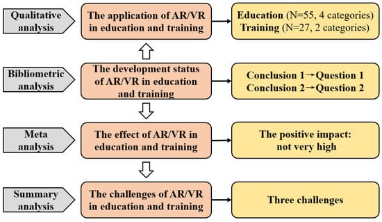 After screening 82 studies, an analysis of the selected publications by year, journals, and conferences was performed. In addition, analysis based on four methods (i.e., bibliometric analysis, qualitative analysis, meta-analysis, and summary analysis) was also conducted. As shown in Figure 4, firstly, 82 studies were analyzed for abstract co-occurrence topic using the VOSviewer to obtain the current status of AR/VR applications for education and training in the AEC industry. Based on the results of the co-occurrence analysis, two research questions for this study were formulated. Secondly, in this review, the application of AR/VR in the field of AEC education referred to the teaching exploration conducted by researchers on courses or specific knowledge points for students. The application of AR/VR in AEC training referred to the training activities carried out by companies or research institutions to improve the relevant professional skills of workers. According to this classification, this study used NVivo 11 for qualitative analysis and coding to classify the 82 studies into 55 studies in the education domain and 27 studies in the training domain. In the education domain, these 55 studies were further classified into immersive AR/VR learning, AR/VR for structure analysis, visual-aided design tools, and AR/VR-based teaching aids in application domains. In the training domains, these 27 studies were further classified into AR virtual operation guide and safety training. Thirdly, 17 studies were included in the meta-analysis based on the inclusion criteria. The actual impacts of AR/VR were quantitatively counted, and the results were obtained in accordance with the analysis. Finally, the results of the meta-analysis showed that AR/VR technologies had a positive effect on education and training in the AEC industry. However, the positive impact was not very significant, suggesting that there are still some limitations to the application of AR/VR in education and training in the AEC industry. Therefore, the current challenges of AR/VR for education and training in the AEC industry are also discussed at the end.
