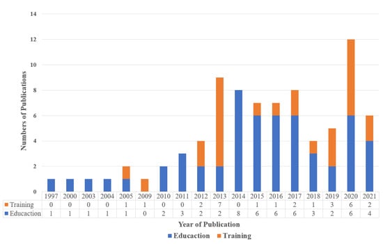 From 1997 to 2021, 82 studies on AR/VR for education and training in the AEC industry were identified (Figure 5). The annual number of related publications has shown an upward trend in general. Around 80.49% of studies were published after 2013 which means that AR/VR has become more popular from 2013 onwards. The number of studies has reached the highest value in 2020, demonstrating that AR/VR has received increasing attention in education and training in the AEC industry, and thus indicating the demand in exploring new ways of teaching reform through AR/VR technologies.