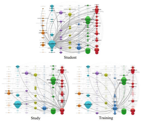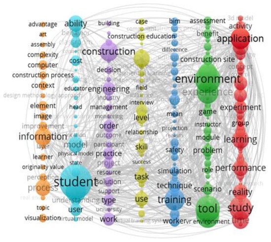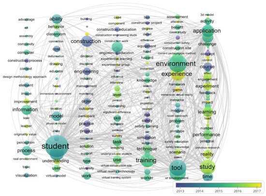 With the help of a Java-based scientific visualization tool named VOSviewer [27] which was developed by the Nees Jan van Eck and Ludo Waltman Centre for Science and Technology Studies Leiden University, the co-occurrence abstract field analysis was selected to output the network and time visualization of abstract field co-occurrence in education and training, as depicted in Figure 6 and Figure 7. On the basis of many experiments, five was chosen as the minimum number of occurrences of a term. Thus, 118 of the 2215 items met the threshold in education studies and training studies. As these networks are usually weighted networks, edges not only represent the relationship between nodes, but also the strength and weight of the relationship [28]. The co-occurrence abstract field was grouped into several clusters with various colors. Through the combined analysis of Figure 6 and Figure 7, as the years increase, new application fields continue to emerge, such as “safety education”, “equipment operation”, and “hazard recognition”. In addition, we took “student”, “study”, and “training” as the main items, and observed the relationship between other items and them. It was found that “ability”, “performance”, “skill”, and “improve” items related to them (Figure 8). Then, the content of the selected 82 studies was reviewed again. The current status of AR/VR for education and training in the AEC industry was revealed. Two conclusions were obtained as follows: