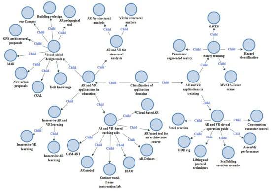 A qualitative analysis of 82 studies was conducted using NVivo 11. The 82 studies were coded and classified by application domains according to a three-level coding based on rooting theory. The coding analysis is shown in Figure 9. After these nodes were classified, 55 studies on education were divided into four categories, namely (a) immersive AR/VR learning, (b) AR/VR for structure analysis, (c) visual-aided design tools, and (d) AR/VR-based teaching aids. Immersive AR/VR provides a risk-free environment for learning by simulating an actual construction environment [29]. AR/VR for structure analysis aims to help student visualize and understand complex spatial arrangements, which usually deform or move under external actions [30]. A visual-aided design tool is beneficial for enhancing the learning ability of students for interior and exterior design as well as making appropriate design decisions, as teaching contents are well visualized using AR/VR-based teaching aids [21]. Twenty-seven studies on training were divided into two categories, namely (a) the AR/VR virtual operation guide and (b) safety training. The first category taking up 59% of the identified studies of training relates to manipulate complex equipment, while the second category accounting for 41% was used to deliver various elements of instructional training for hazard identification and accident prevention (shown in Figure 10). More details of each category of AR/VR application are introduced in the following sections.