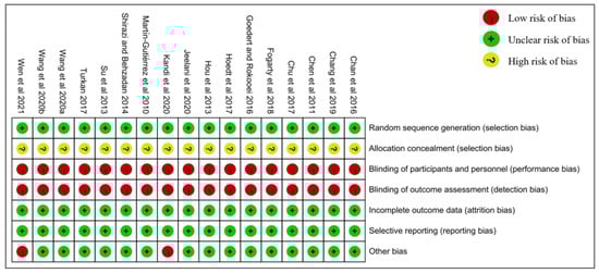 Meta-analysis is a method of secondary synthesis and evaluation from original studies, and the quality of the meta-analysis is directly affected by whether the quality of the included studies is accurately and critically evaluated [109]. Therefore, it is particularly important to evaluate the quality of the included studies in the meta-analysis. In this study, two researchers assessed the risk of bias for all selected studies based on the Cochrane risk bias assessment tool in six fields: (1) selection bias; (2) performance bias; (3) detection bias; (4) attrition bias; (5) reporting bias; and (6) other bias [110], as shown in Table 2.