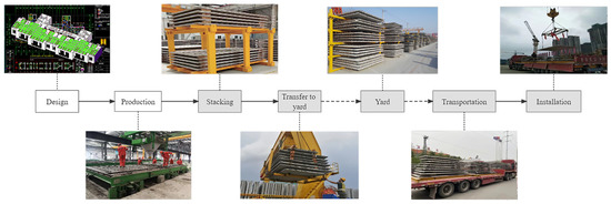 Research interviews with factory stacking crews and installation crews revealed that most prefabricated factories have adopted a more efficient storage rack for horizontal components such as PC slabs. The storage rack is simple in structure, less expensive, and can effectively increase the storage capacity of the yard. After producing PC slabs, there are four main steps: off-line stacking, yard transfer, outbound transport, and installation. In the stacking process, the workers stack the finished PC slabs that have been demolded and rolled off the assembly line onto the storage racks in the temporary stacking area in the workshop. The operator usually allocates positions according to the project’s requirements, floor information, and delivery date during the stacking process. The storage requirements for PC slabs limit each rack to a maximum of six PC slabs, and only one component can be placed on each layer. Square timber is placed between the components to prevent additional stress on the components during storage. To prevent delays in the delivery of the components, the factory usually maintains a stock level of one or two stories, so most of the finished PC slabs are transferred to a larger outdoor yard for storage by means of a whole stack. For outbound transport, the transporters park a truck at the manually recommended loading point. An operator operates the portal crane to lift all the component storage racks on the floor to be transported from the storage area to the transport truck to complete the outbound delivery. When the components arrive at the site, a crane operator lifts them directly from the transport truck to the installation position. The construction process for the PC slabs is shown in Figure 1.