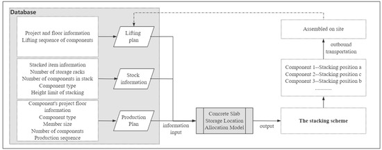 In this paper, heuristic algorithms and a mathematical model are used to simulate the process of optimizing the storage-location allocation of PC slabs. The flow chart is shown in Figure 2. First, the relevant attribute information of the PC slab is determined in the design and production stage, including the project floor to which it belongs, the length, width, and type of the component, the weight, the serial number of the component, the number of storage racks required, etc. As each project has an assigned person who is responsible for generating installation plans, the sequence is typically available and provided to the stacking crews as one of the inputs for generating stacking plans. The database for generating the stacking plans is constructed through the collection of this information. Then, the PC slab storage-location allocation model reads the production plan information, component location information, and component lifting plan from the database as a basis for judgment and information input. Finally, the heuristic algorithm is used to solve the model, and optimized stacking plans are obtained, which can assign the PC slabs off-line in this batch to appropriate stacking positions. The simulation model is then exited after allocation.
