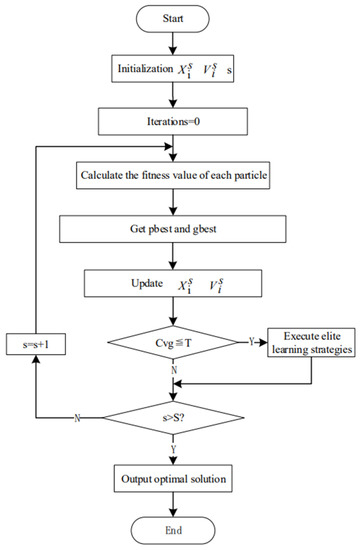 The elite learning strategy is an optional step that is not performed at every iteration. Only when Cvg ≤ T can the activity of the global optimal solution gbest be enhanced by executing the elite learning strategy, guiding it by a positive force and leading the entire population to jump out of the local optimum. It can be seen from the above that the convergence threshold T is the key to judging whether the population is in a convergent state. If the value of T is too small, the ability of the elite learning strategy to jump out of the local optimum will not be fully exerted; however, if the value of T is too large, the population update will be improved. The number of times the elite learning strategy is executed during the process increases the computational burden of the system. Therefore, this paper will determine the convergence threshold T by an experimental method. To sum up, the flow of the ELPSO algorithm is shown in Figure 5.